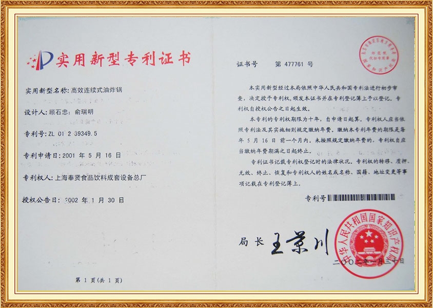 Patent Certificate High Efficiency Continuous Oil Frier