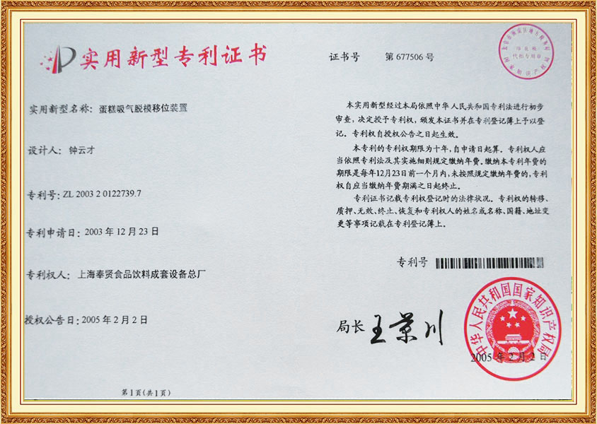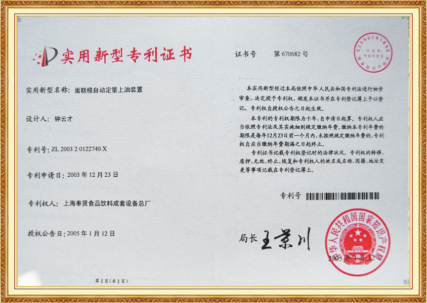 Patent Certificate Quantitate Oil Feeding System in Cake Production Line