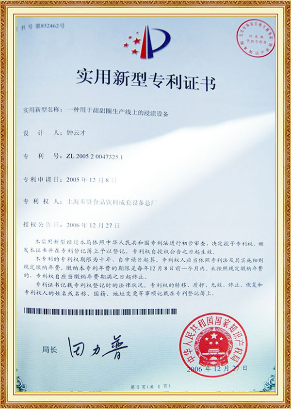Patent Certificate Soaking Machine for Dughnut Production Line