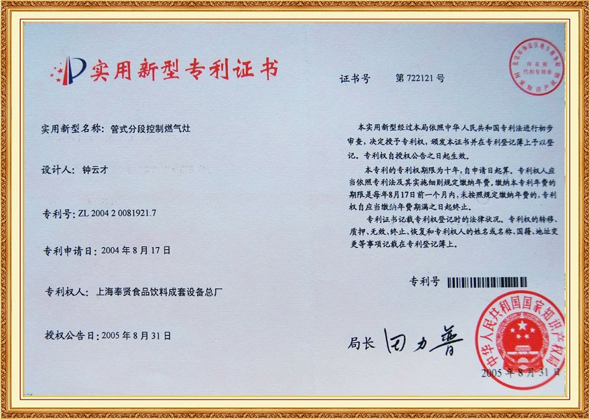 Patent Certificate Gas Tunnel Oven for Biscuit Processing