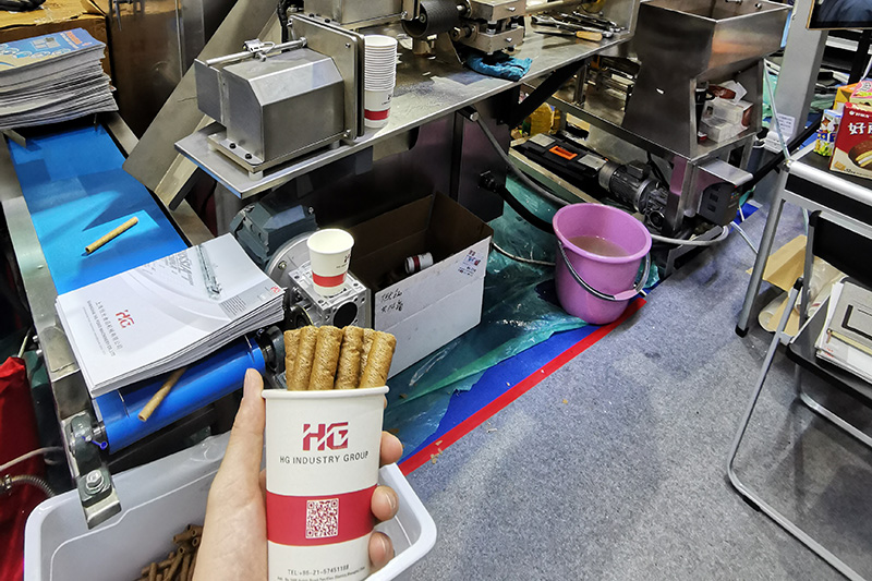 HG showcased its equipment in the food machinery exhibition area, highlighting proprietary rice cracker lines, White Lover cookie lines, cake production lines, customized soft and hard biscuit lines, and egg roll machines.