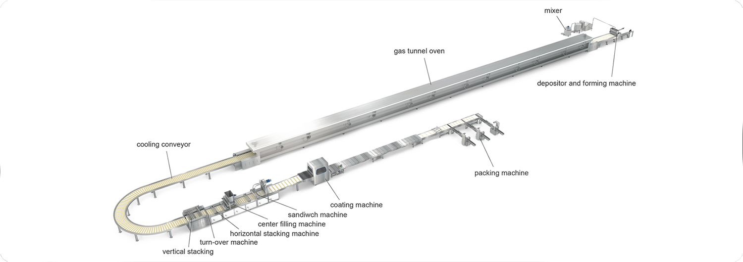 A standard choco pie production line consists of a slurry mixer, paper feeder, depositing and forming machine, tunnel oven, cooling conveyor, paper recycling unit, stacking machines, cake turnover machine, sandwiching machine for cream filling, and cooling equipment. For extended product varieties, a chocolate coating machine can be added to produce coated chocolate pies.