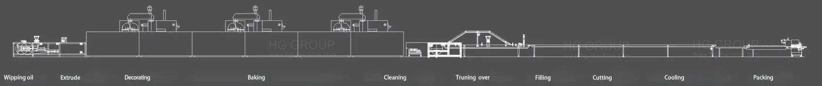 Main equipment: Oil wiping machine, extruder, chocolate decorating machine, gas oven, dry cleaning machine, turn over machine, cutting machine, cooling conveyor, and packing machine.